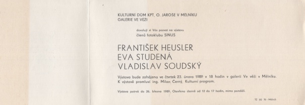 | 1989/02/23 - 1989/03/26 | František Heusler, Eva Studená, Vladislav Soudský: Výstava členů fotoklubu Sinus, Galerie ve věži, Mělník (Mělník) |
